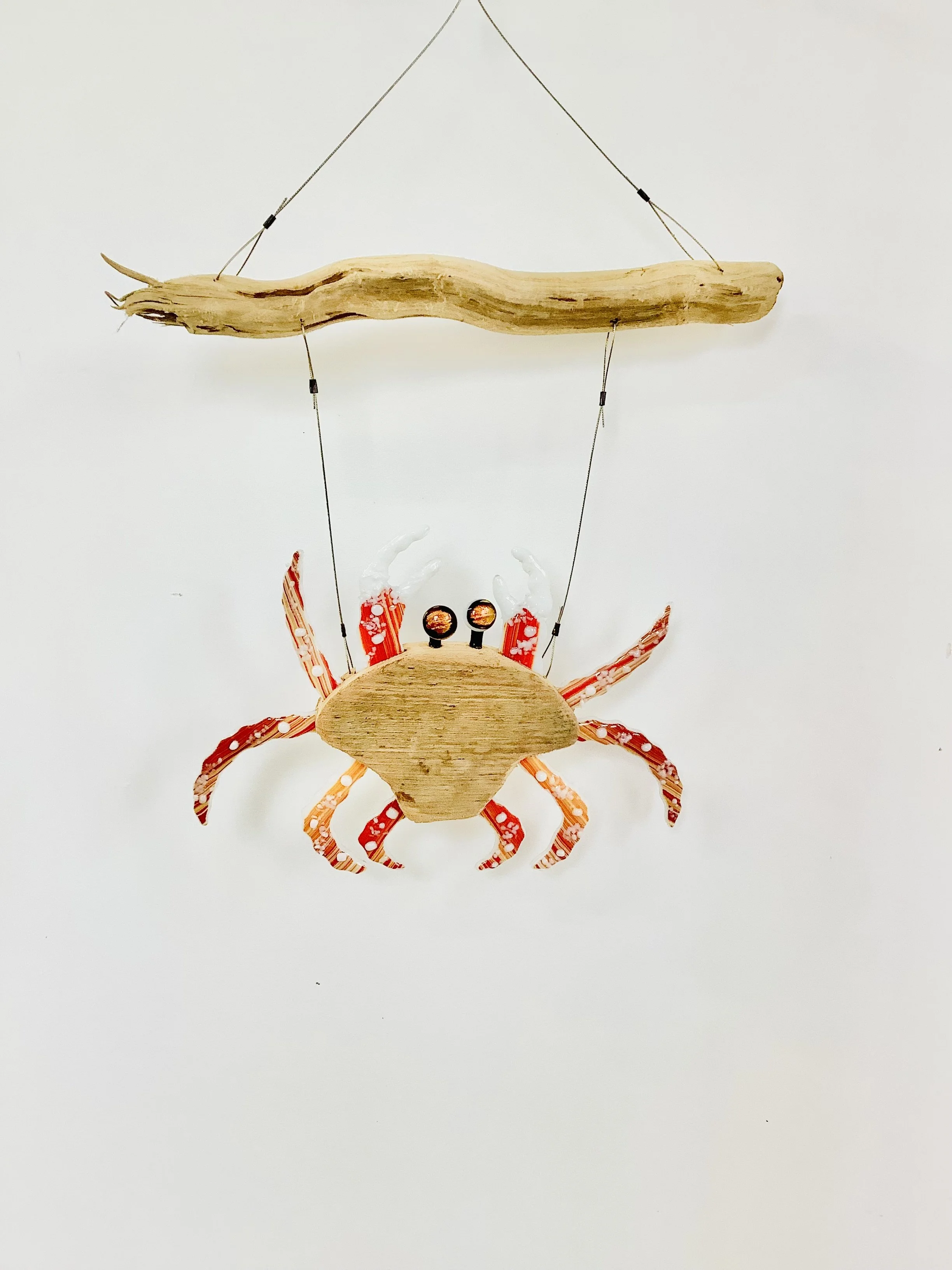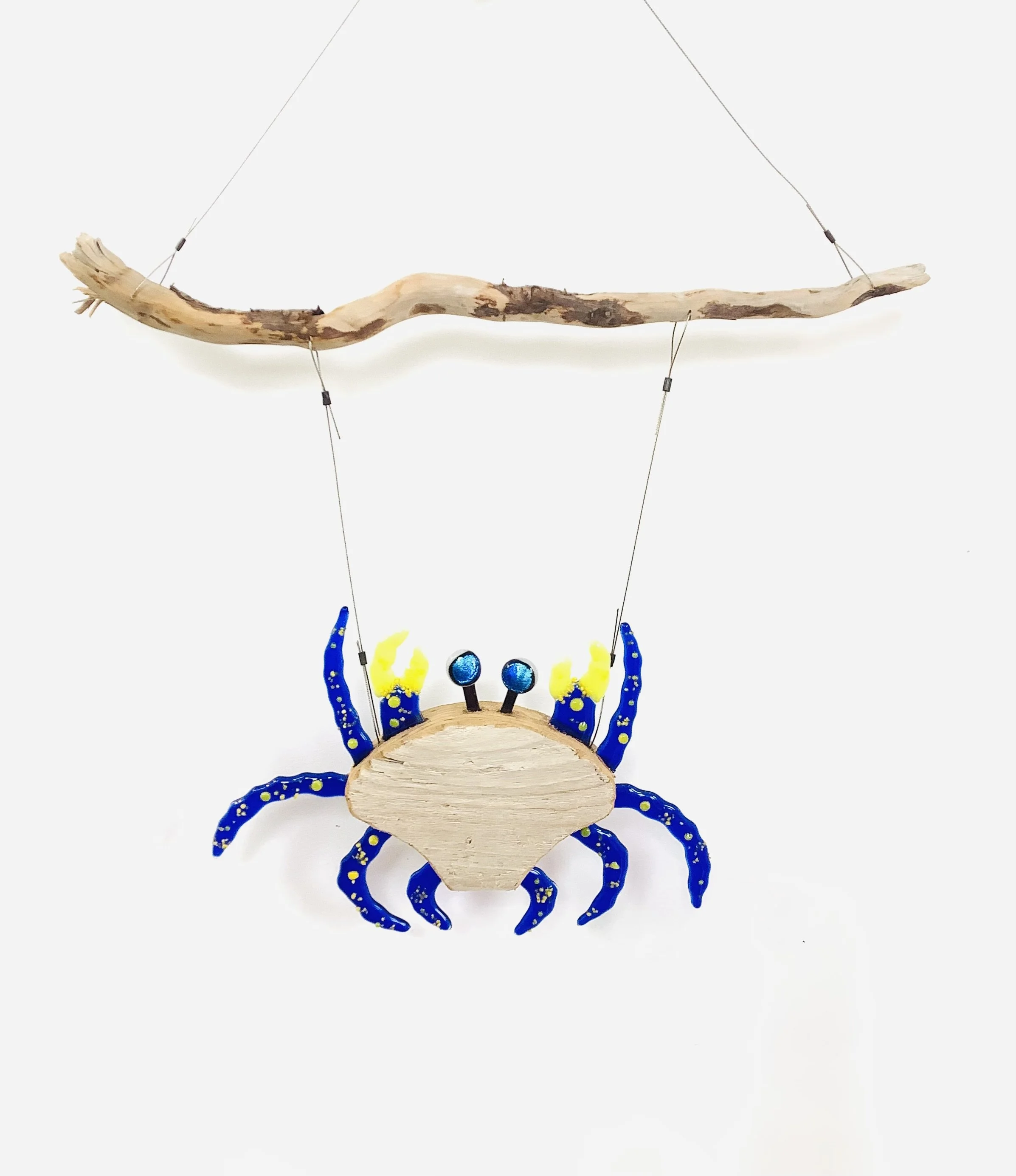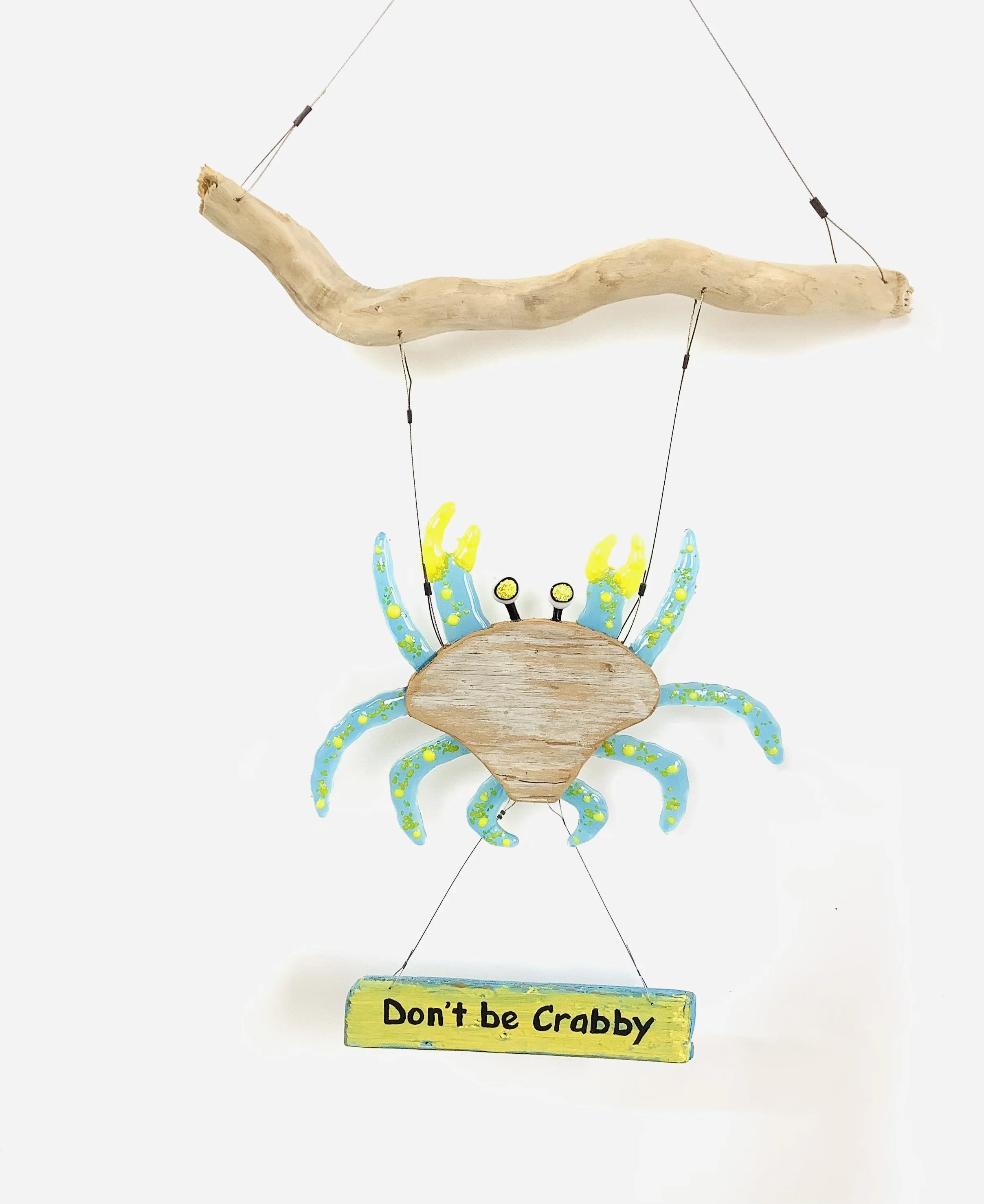 $140 "Crab Pitt" Light blue fused glass sprinkled with yellow glass frit and glass dots. Hangs 29"x14" from stainless wire and Vancouver Island driftwood. Hand painted acrylic "don't be crabby" sign. Contact to purchase.