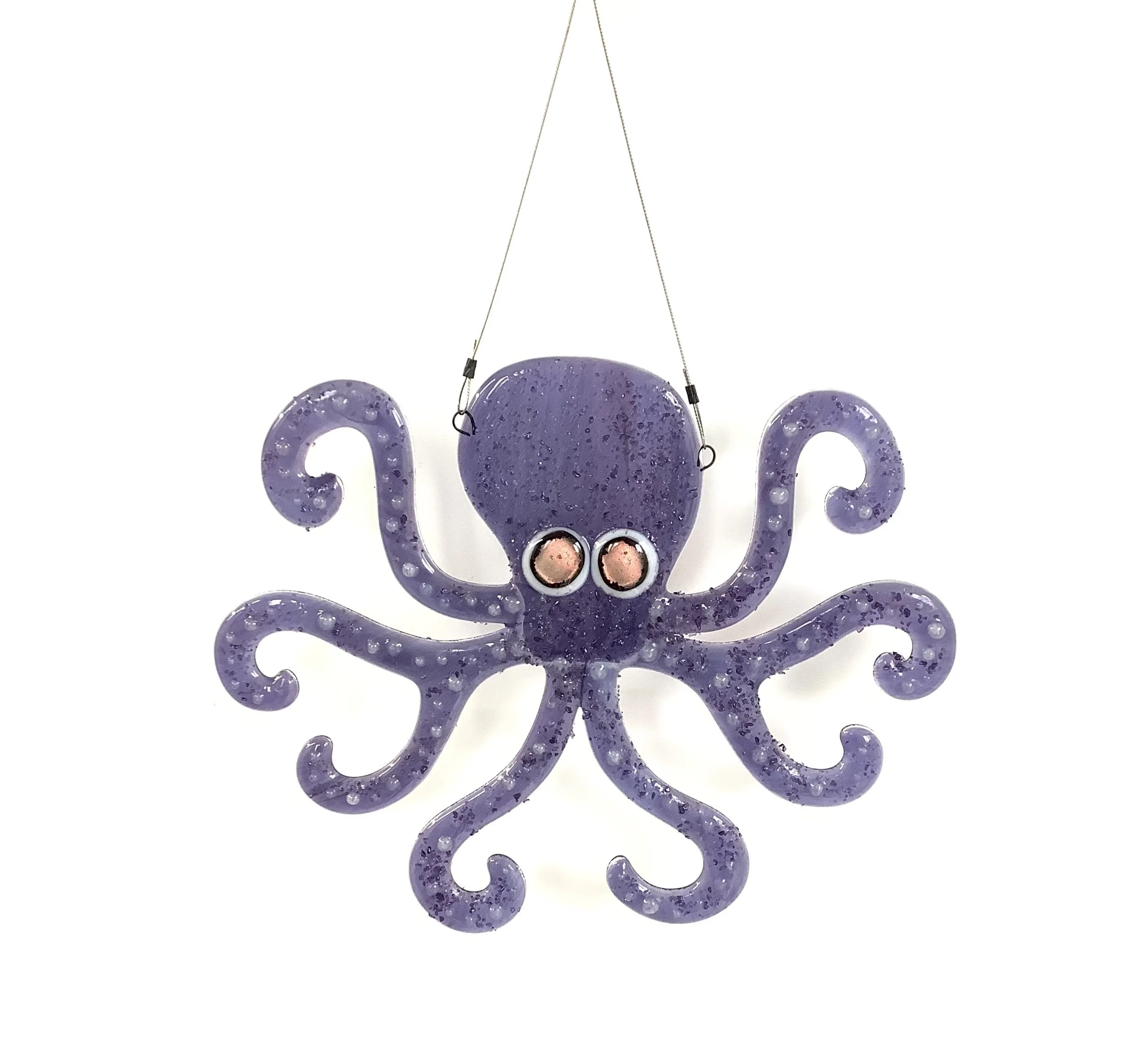 $125 " Kraken a cold one" Purple fused glass sprinkled with purple glass frit and white glass dots. Hangs 17"x11" from stainless wire. Contact to purchase.