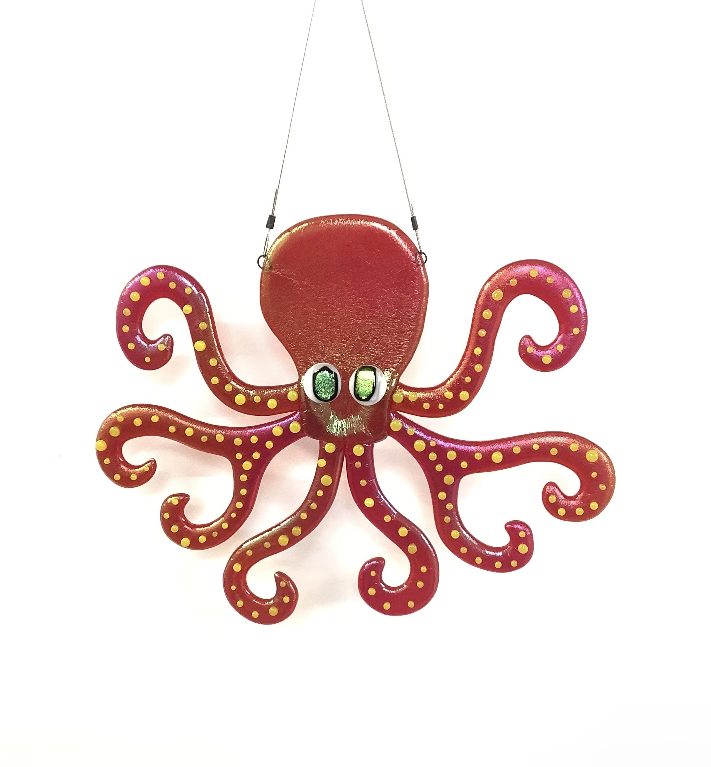 $125 "Billy the squid" Red iridescent fused glass with yellow glass dots. Hangs 19"x11" from stainless wire. Contact to purchase.