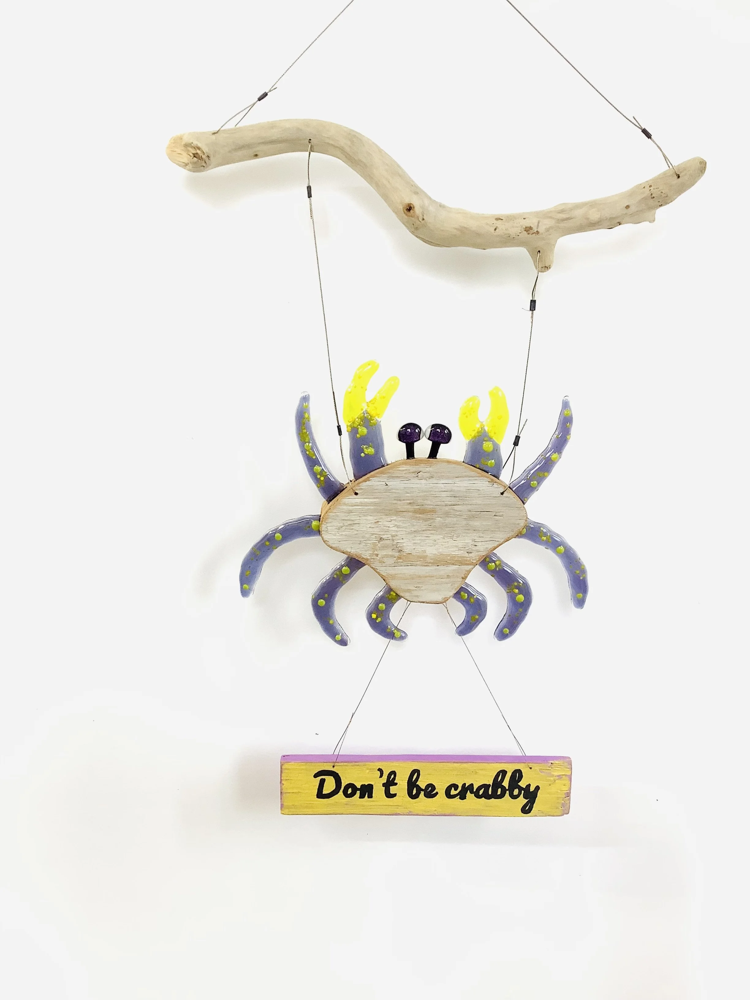 $140 "Leonardo da pinchi" Purple fused glass sprinkled with yellow glass frit and dots. Hangs 26"x13" from stainless wire and Vancouver Island driftwood. Hand painted acrylic "don't be crabby " sign. Contact to purchase.